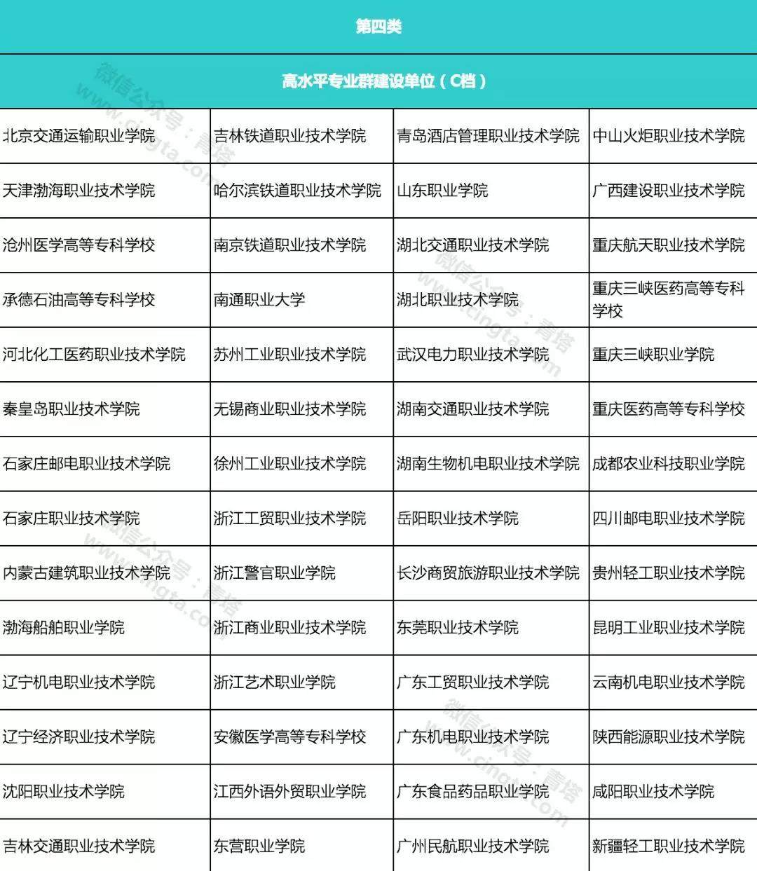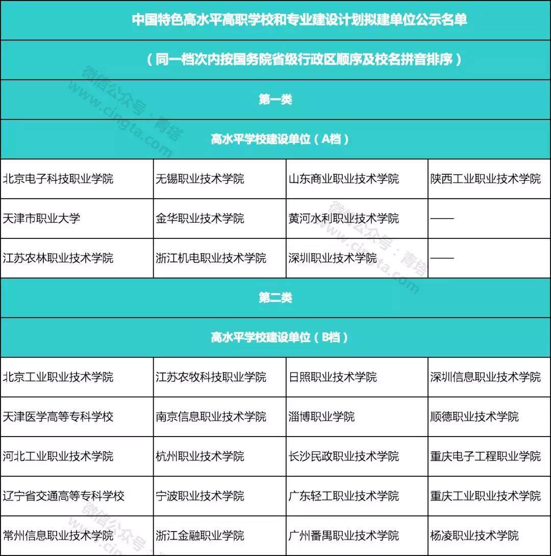 據(jù)悉,入圍“雙高計(jì)劃”的高職院校分為四類,其中類包括:高水平學(xué)校建設(shè)單位(A檔)10所;第二類包括:高水平學(xué)校建設(shè)單位(B檔)20所;第三類包括:高水平學(xué)校建設(shè)單位(C檔)26所、高水平專業(yè)群建設(shè)單位(A檔)26所、高水平專業(yè)群建設(shè)單位(B檔)59所;第四類包括高水平專業(yè)群建設(shè)單位(C檔)56所。